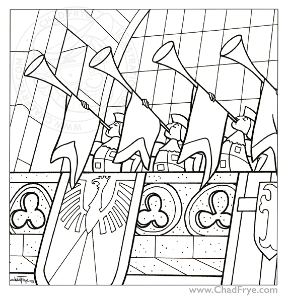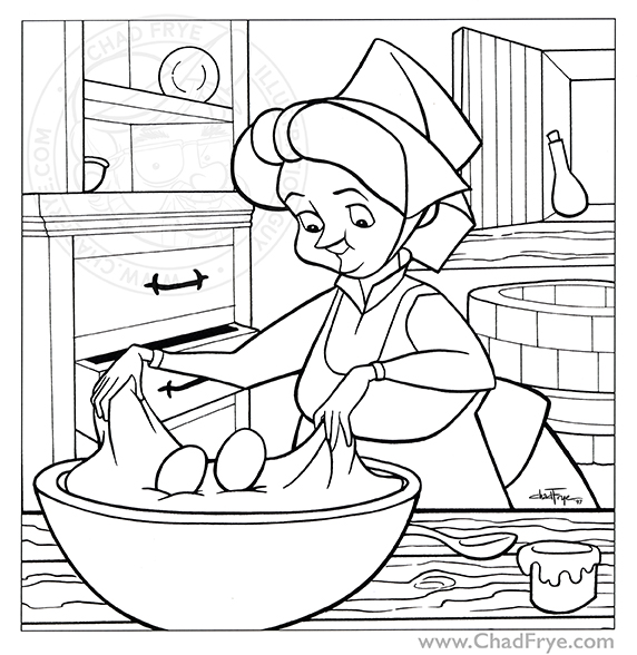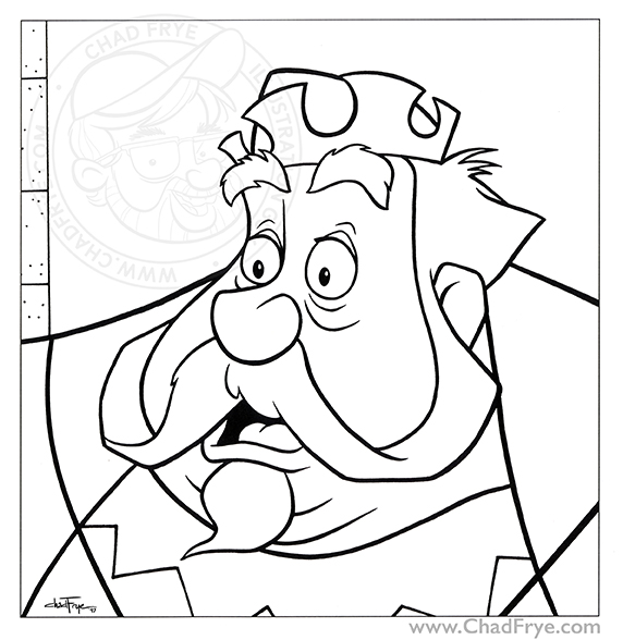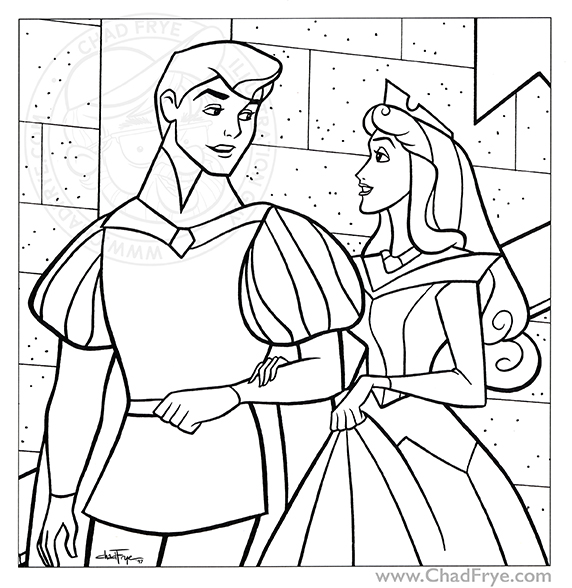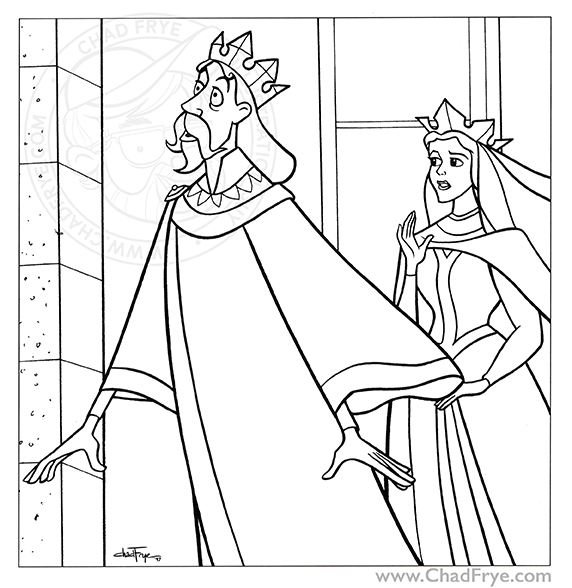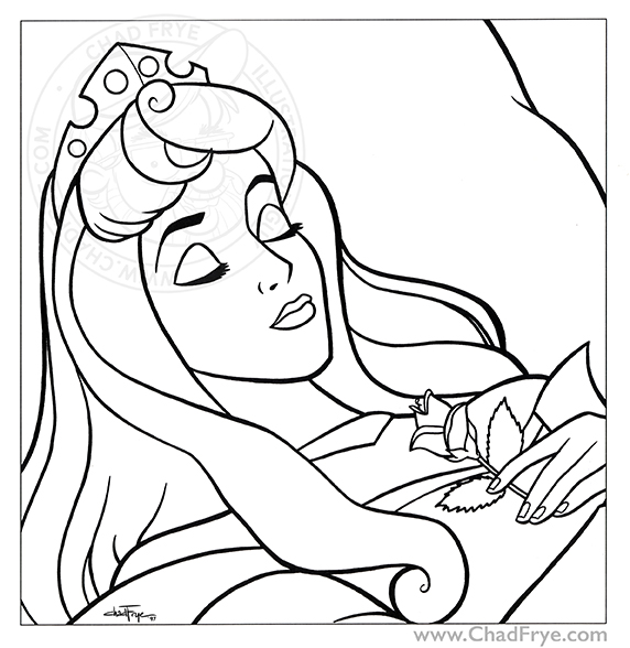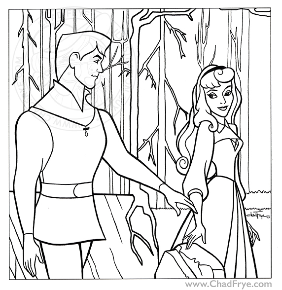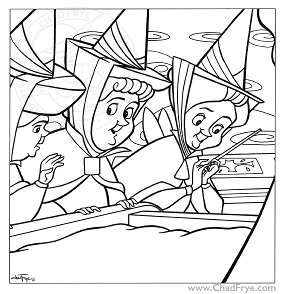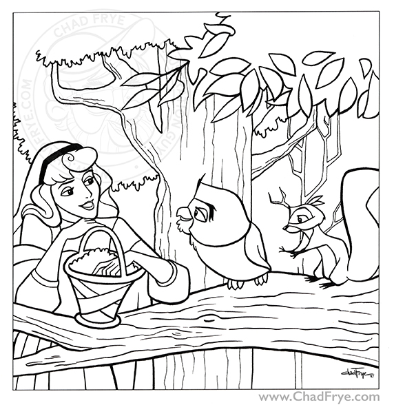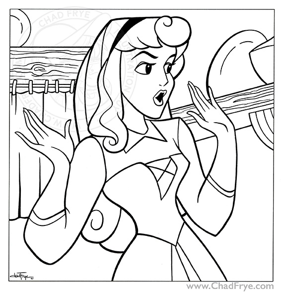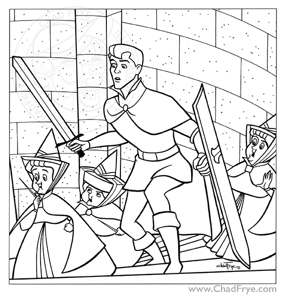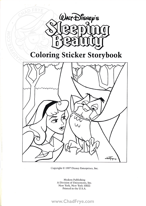 Over the years I’ve had the opportunity to illustrate six or seven coloring books based on existing characters. These are a few traditional ink drawings from Disney’s Sleeping Beauty. The publisher wanted drawings based directly on specific shots in the movie, so it wasn’t a new interpretation of the property other than distilling the images down to be simplified for kids to color, without them having to cry over the details seen in the film. Mischievously, I still gave them a bit of woodgrain to deal with, though. The cover is included here just for reference sake; that is the one image I was not asked to do. For this publisher, coloring books were anonymous, so neither my name nor that of the cover artist appear on the title page.