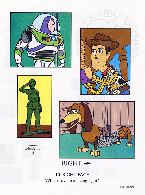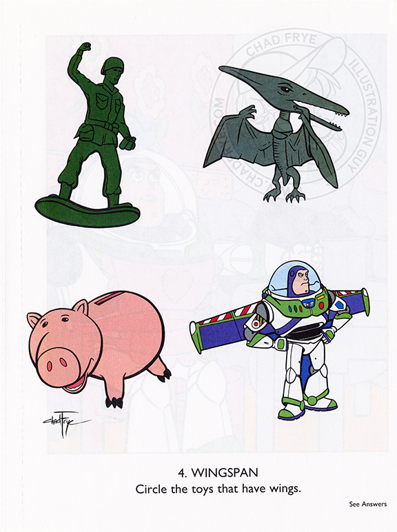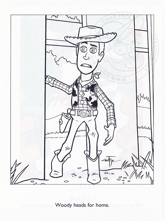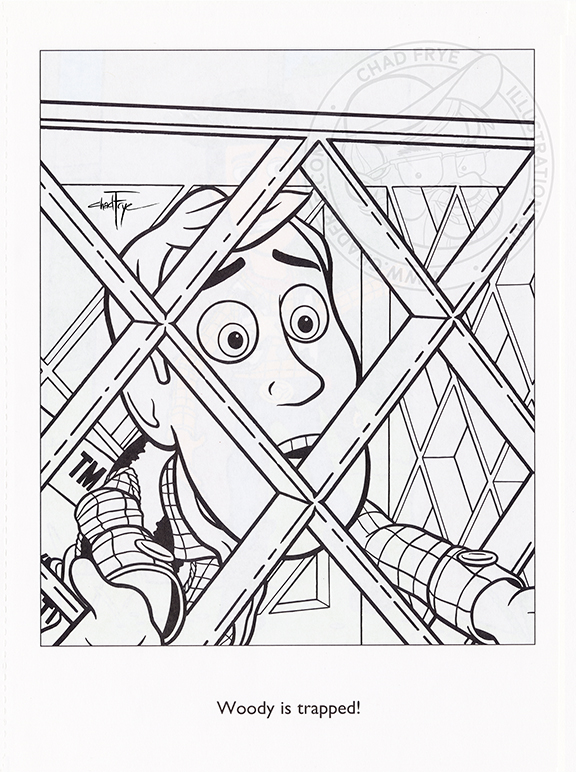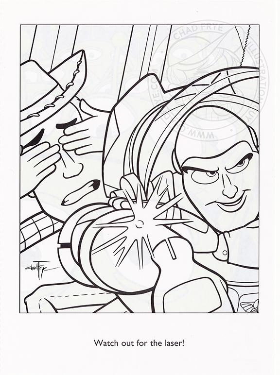 Over the years I’ve had the opportunity to illustrate six or seven coloring books based on existing characters. These are a few traditional ink drawings from Disney’s Sleeping Beauty. The publisher wanted drawings based directly on specific shots in the movie, so it wasn’t a new interpretation of the property other than distilling the images down to be simplified for kids to color, without them having to cry over reproducing the details seen in the film. Mischievously, I still gave them a bit of woodgrain to deal with, though. The cover is included here just for reference sake; that is the one image I was not asked to do. For this publisher, coloring books were anonymous, so neither my name nor that of the cover artist appear on the title page.